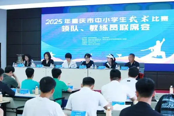 开幕式当天,2025年重庆市中小学生武术比赛领队、教练员联席会同步举行。重庆市教委体卫艺处四级调研员任贞玲围绕提高政治站位、强化责任意识、确保赛事安全等方面,提出四点要求,保障大赛公平、公正、安全开展。